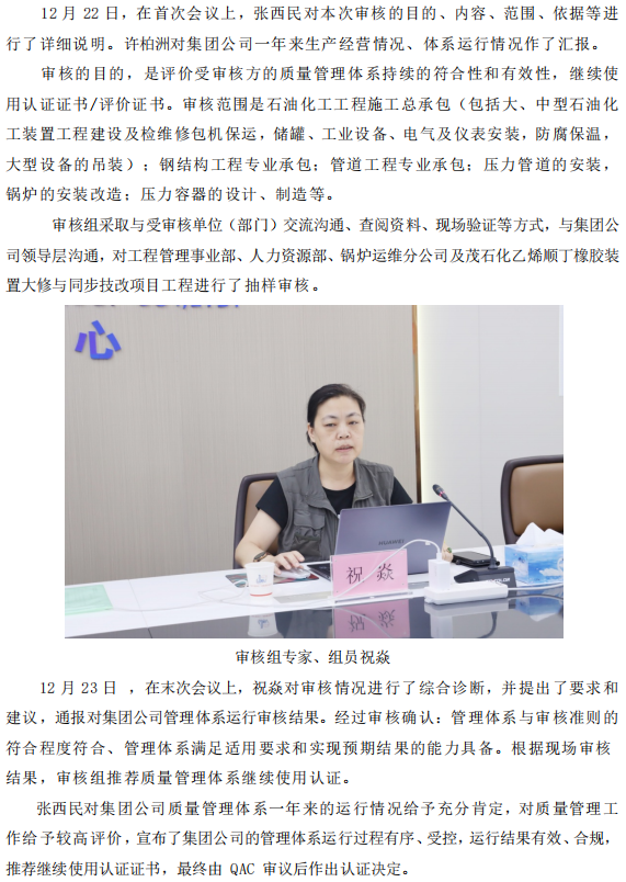集團(tuán)公司通過質(zhì)量管理體系年度監(jiān)督審核